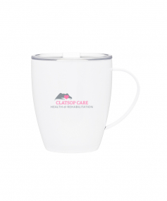 12 oz double wall 18/8 stainless steel thermal mug with copper vacuum insulation, clear acrylic push-on lid, and matching swivel; Hand wash recommended; Do not microwave; 4-7/16" h x 4"w (4-7/8 with handle) ; 355mL.