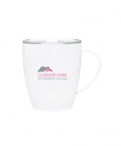 12 oz double wall 18/8 stainless steel thermal mug with copper vacuum insulation, clear acrylic push-on lid, and matching swivel; Hand wash recommended; Do not microwave; 4-7/16" h x 4"w (4-7/8 with handle) ; 355mL.