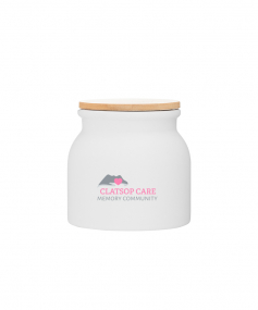 16.9 oz stoneware: matte white out / glossy white in with push-on bamboo lid; Hand wash recommended; Microwave safe with non-metallic imprint; 4 3/16 h x 4 3/16 (w/handle) w ; 500mL.
