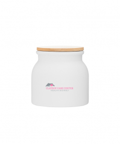 16.9 oz stoneware: matte white out / glossy white in with push-on bamboo lid; Hand wash recommended; Microwave safe with non-metallic imprint; 4 3/16 h x 4 3/16 (w/handle) w ; 500mL.