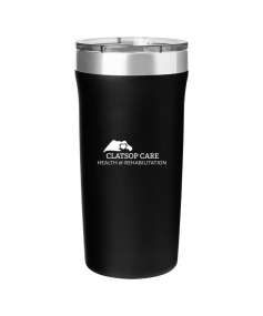 18 oz double wall 18/8 stainless steel thermal tumbler with vacuum insulation, brushed stainless steel rim, clear push-on acrylic lid with sliding closure, and powder coated finish. Hand wash recommended. Do not microwave. Complies with FDA, Prop 65. 7.25" H x 3.5" W