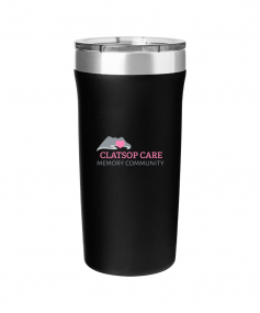 18 oz double wall 18/8 stainless steel thermal tumbler with vacuum insulation, brushed stainless steel rim, clear push-on acrylic lid with sliding closure, and powder coated finish. Hand wash recommended. Do not microwave. Complies with FDA, Prop 65. 7.25" H x 3.5" W