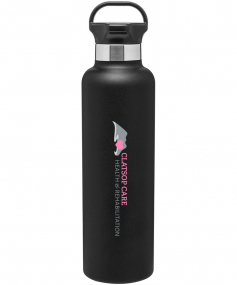 24 oz powder coated double wall 18/8 stainless steel thermal bottle with copper vacuum insulation, threaded gear-shaped insulated lid and carrying handle Complies with FDA, Prop 65. 11.25" H x 3" W