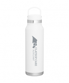 25 oz double wall 18/8 stainless steel thermal bottle with copper vacuum insulation, threaded insulated lid with carrying handle, high polish accent, stainless steel base, and powder coated finish. Hand wash recommended; Do not microwave. Dimensions: 10 H x 3".