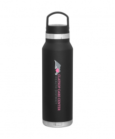 25 oz double wall 18/8 stainless steel thermal bottle with copper vacuum insulation, threaded insulated lid with carrying handle, high polish accent, stainless steel base, and powder coated finish. Hand wash recommended; Do not microwave. Dimensions: 10 H x 3".
