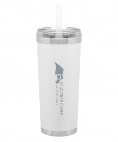 24 oz double wall 18/8 stainless steel thermal tumbler with copper vacuum insulation, stainless steel rim and base, threaded Eastman Tritan lid, snap closure, straw opening, and flexible wide silicone straw.