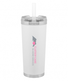 24 oz double wall 18/8 stainless steel thermal tumbler with copper vacuum insulation, stainless steel rim and base, threaded Eastman Tritan lid, snap closure, straw opening, and flexible wide silicone straw.