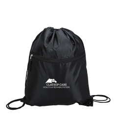 Sport bag with a contrast color front-zippered pocket, reinforced corners and a drawstring closure. Drawstrings double as backpack straps. 12 1/2" W x 15 1/2" H x 3/16" D.