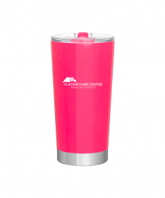 20 oz double wall 18/8 stainless steel thermal tumbler with vacuum insulation, and clear acrylic push-on swivel lid. Hand wash recommended. Do not microwave. Complies with FDA, Prop 65. 7.125" H x 3.75" W